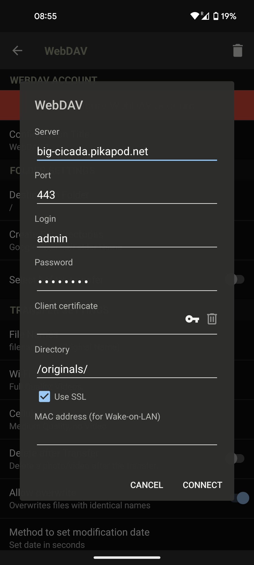 The official PhotoPrism site already has a guide on how to sync with different mobile apps. For PikaPods specifically, the settings are as follows for WebDAV-based sync: