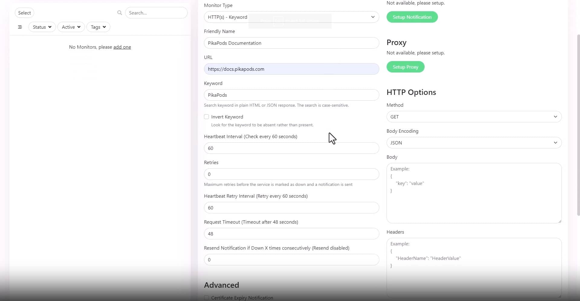 - Add URL: Enter the URL or hostname you wish to keep an eye on. For keyword monitoring, typically, you’d input a website link, such as “https://docs.pikapods.com”.
